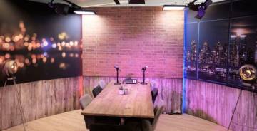 Estudio completo para entrevistas y webinars grandes. Incluye 3 cámaras y 4 micrófonos