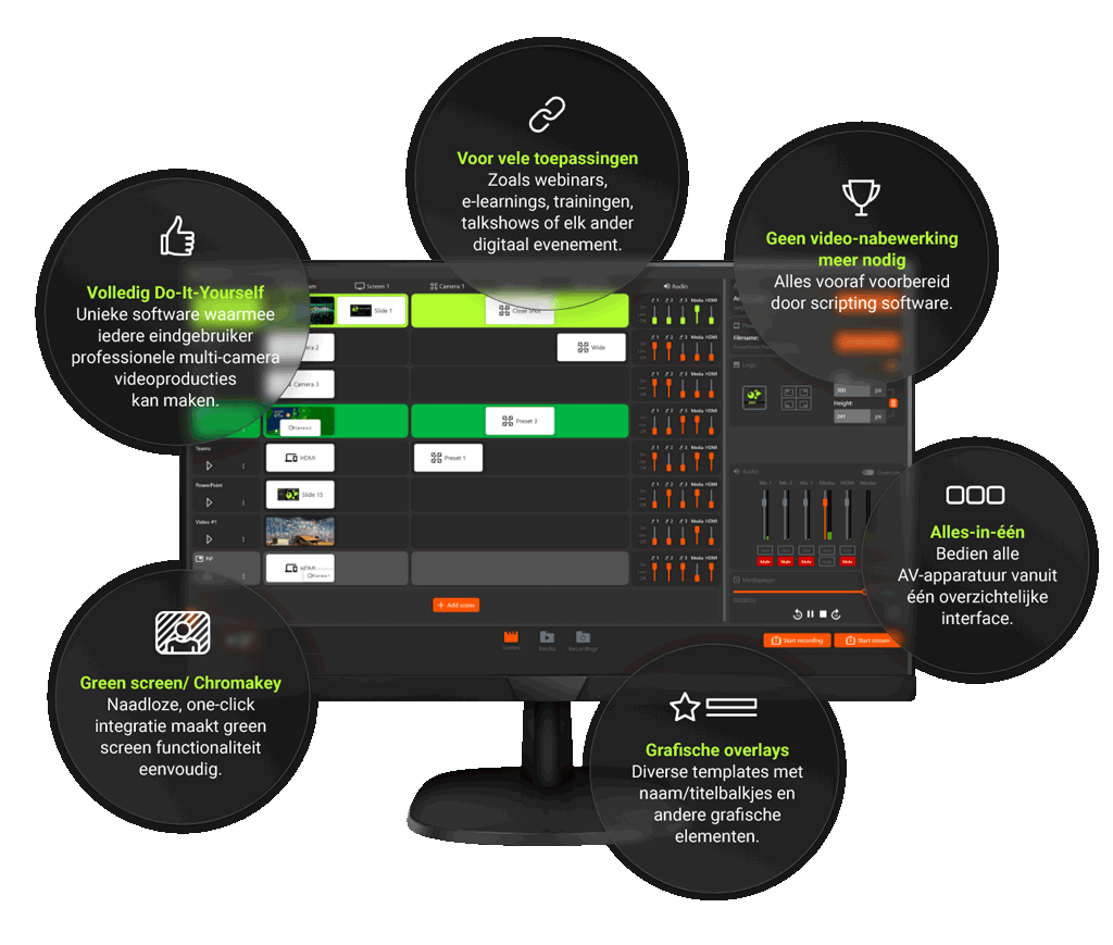 multicamera livestreams en opnames. Doe-het-zelf, geen AV-expertise vereist.